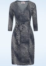 Mühelos stylisch: Das zeitlose Wickelkleid Lola Dot ist aus einem marineblauen Stoff gefertigt, der durch einen verspielten Polka-Dot-Print in Wollweiß besticht. Die ¾-Ärmel und das geschmeidige, weich fließende Material sorgen für einen bequemen Look. Das vielseitig kombinierbare Modell knittert nicht und ist herrlich angenehm zu tragen – ein perfekter Reisebegleiter! 😉 * Wickelkleid * ¾-Ärmel * Fest vernähte Schleifenbänder * Endet bei einer Körpergröße von 1,70 m unterhalb des Knies * Exklusiv bei Topvintage erhältlich