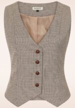 “If I could live in this suit… I would!“ Hallie ist eine wunderbare Ergänzung für deine Garderobe! Diese Weste (ohne Ärmel) zeigt sich im klassischen Business-Look, aber kann auch perfekt als ein Single Statement Piece getragen werden! Gefertigt wurde diese Weste aus einem festen, kaum dehnbaren, aber doch angenehmen, mit Satin gefütterten Stoffmix mit einem Hauch Viskose, der ein wunderschönes Pied de Poule Karo in unterschiedlichen Brauntönen zeigt. * Weste * Ärmellos * V-Ausschnitt * Knopfverschluss * Dekoratives Gürtel-Detail hinten * Satin-Futter * Vollende deinen Look und kombiniere sie mit der passenden Eliza Pied de Poule Stoffhose