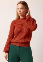 Dieses Shirt gehört in deinen Kleiderschrank! Es hat eine hohe Halslinie, lange Puffärmel und wurde aus einem gestrickten, weichen, geschmeidigen und dehnbaren Acrylmix in Rostbraun mit einem Hauch Alpaka/Wolle gefertigt und mit einem klassischen Lochmuster versehen. Dieses Schätzchen ist ein wahres Must-have für die kommende Saison! * Hohe Halslinie * Lange Puffärmel * Lochmuster * Stretchy Rippbündchen * Lang genug, um mit einer normalen Hose kombiniert zu werden