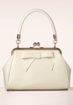 “Just a daydream away!“ Diese kleine Schwester der klassischen American Vintage Tasche hat einen auffällig goldfarbenen Metall-Clipverschluss für den wahren Vintage Look und wurde aus einem matten Kunstleder in Creme gefertigt und mit einer süßen Schleife vollendet. * Small sized * Clipverschluss * Innenfach mit 3 zusätzlichen Fächer, eins davon mit Reißverschluss * Abnehmbarer Henkel * Kann ‚crossbody‘ getragen werden * Komplett gefüttert * Ausreichend Platz für dein Handy, deine Schlüssel und ein kleines Portemonnaie