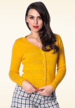 Der Little Luxury Cropped Cardigan ist ein echter Klassiker! Elegant in seiner Einfachheit und daher DIE perfekte Ergänzung zu all deinen Vintage-Kleidungsstücken! Diese kurze Strickjacke hat einen eleganten V-Ausschnitt und leicht geraffte lange Ärmel, die etwas lässig geschnitten sind. Hergestellt aus einem fein gestrickten Senfgelb-Viskosemix mit einem angenehmen Stretch für eine schöne figurbetonte Passform. Die Kombinationsmöglichkeiten sind endlos! * V-Ausschnitt * Lange Ärmel * Knopfleiste * Elastischer Rippbund an Ärmeln und Saum * Kurzer Stil