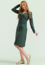 Wie gemacht für gemütliche Tage und jede Menge Komplimente: Dieses wunderschöne langärmelige Kleid besticht durch einen V-Ausschnitt mit Wickeloptik und eine schmeichelhafte Raffung. Das dezente Taillenband betont deine Silhouette auf natürliche Art und der knielange, fließende Rock bewegt sich bei jedem Schritt anmutig mit. Das Modell ist aus einer superbequemen und elastischen (Bio-)Baumwollmischung in Dunkelgrün gefertigt und besticht durch ein grafisches Muster aus Blumen und Herzen. * Swing-Style * Lange Ärmel * Gekreuzter Ausschnitt mit Raffung * Kein Reißverschluss, keine Knöpfe: einfach reinschlüpfen und los geht’s! * Endet bei einer Körpergröße von 1,70 m knapp unterhalb des Knies