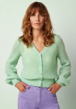 Ein Klassiker in modernem Gewand! Diese vielseitig kombinierbare pastellgrüne Strickjacke mit Knopfleiste und auffälligen langen Puffärmeln ist aus einer grob gestrickten, anschmiegsamen und elastischen Acrylmischung mit Woll- und Mohair-Anteil gefertigt. Das Modell besticht durch ein attraktives Lochmuster. * V-Ausschnitt * Lange Puffärmel * Knopfleiste * Lochmuster * Elastische Rippbündchen * Passend für Hosen mit normaler Leibhöhe