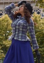 Eine Hommage an zeitlose Weiblichkeit: bei diesem Modell trifft ein softer Schnitt auf die Romantik des Pariser Winters. Die Blazerjacke Enora Tiffany aus der neuen Kollektion von Miss Candyfloss wurde von der herausragenden französischen Modedesignerin Marie-Louise Carven inspiriert, die in den 1940er und 1950er Jahren Pionierarbeit leistete und die Modegeschichte nachhaltig prägte. Das taillierte Modell mit langen Ärmeln und Rundkragen ist aus einem Bouclé-Stoff mit geringem Stretchanteil gefertigt, der durch ein Schottenkaro in Violetttönen besticht. * Figurbetonter Schnitt * Rundkragen * Lange Ärmel * Knopfleiste
