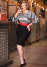 Mit dem richtigen Kleid kann eine Frau die ganze Welt erobern: Das Modell Dorene ist aus einem hochwertigen, robusten und dennoch dehnbaren Viskosemischgewebe gefertigt. Es hat ein schwarz-weiß gestreiftes Oberteil und einen roten Gürtel, der für einen attraktiven Farbtupfer sorgt. Dieses Kleid setzt deine Kurven perfekt in Szene! 😉 * Bleistiftkleid * Gefüttertes Oberteil * U-Boot-Ausschnitt * ¾-Ärmel * Abnehmbarer Gürtel * Schlitz hinten * Verdeckter Reißverschluss hinten * Endet bei einer Körpergröße von 1,70 m unterhalb des Knies * Die tolle Sam ist 1,70 m groß * Exklusiv bei Topvintage erhältlich