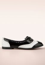 Räume einen Platz in deinen Schuhschrank ein für diese verspielten Milana Brogues! Diese wundervolle Schnürer im Stil der 50er und 60er Jahren sind einfach unwiderstehlich! Hergestellt aus schwarzem Lackleder und cremefarbenem Kunstleder im auffälligen Budapester-Stil und als Sahnehäubchen die niedlichen Schnürsenkel in einem Polkadotmuster. Diese Schätzchen werden die klassischen Schuhe verblassen lassen. * Die Innenseite ist gefüttert mit einem dunkelblauen Stoff in einem Rosenmuster * Komfortable Innensohle * Strapazierfähige Sohle