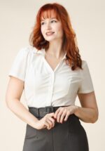 ‚Dress how you want to be addressed! ‚Boss Lady‘ will do just fine!‘ 😉 Du hast die Fäden in der Hand, wenn du diese vielseitige Dianne Blouse in Crispy Weiß trägst! Auch diese Saison haben unsere Inhouse Designer tragbare und klassische Mode mit hyperfemininer Silhouette entworfen – für dich, für mich und alle anderen Powefrauen. Diese leicht taillierte klassische Bluse hat den Komfort eines Tops und wurde mit einem spitzen Reverskragen und 3/4 Ärmeln vollendet. Gefertigt aus einem festen, aber doch angenehmen elfenbeinweißen Stoff – leicht dehnbar trägt er sich herrlich! * Bluse * Leicht tailliert * Spitzer Reverskragen * Gefütterter Brustbereich (damit nichts durchscheint) * 3/4 Ärmel mit spitzem Umschlag * Verdeckter Reißverschluss hinten * Lang genug, um mit einer normalen Hose kombiniert zu werden * Femme Fatale Eden Berlin misst 1,68 m: ihre Accessoires sind Privateigentum
