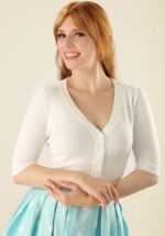 Dieser 50s Overload Cardigan ist ein echter Klassiker! Classy in seiner Einfalt und daher perfekt zu deinen vintage Kleidungsstücken! Dieser kurze Cardigan hat eine elegante V-Halslinie, halbe Ärmel und große, schimmernde Knöpfe. Hergestellt aus einem elfenbeinfarbenen Viskosemix in Feinstrick mit einer angenehmen Elastizität und einer schönen, anschmiegenden Passform. Die Kombinationsmöglichkeiten sind endlos! * V-Halslinie * 1/2 Ärmel * Knopfleiste * Elastische Rippborten an der Halslinie, an den Ärmeln und am Saum * Kurzes Modell
