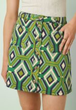 Ein Minirock mit Sixties-Vibes: Das Modell Garbo Cadiz ist verspielt, feminin und erinnert dank seines schmeichelhaften A-Linien-Schnitts und der schildpattfarbenen Knöpfe an die 60er Jahre. Es ist aus einem festen Bio-Baumwollgemisch (nicht dehnbar) gefertigt und besticht durch einen fantastischen geometrischen Retro-Print. * Ausgestellter Schnitt * Knopfleiste * Mit Gürtelschlaufen * Mit Taschen! * Endet bei einer Körpergröße von 1,70 m knapp über dem Knie