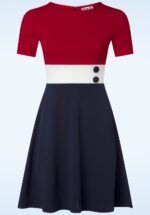 Das Leben ist kurz – also schlag zu und hol dir dieses Kleid! Diese kurzärmelige Vintage-Schönheit mit hohem Rundhalsausschnitt und Zierknöpfen auf der Vorderseite geht ab der Taille in einen leicht schwingenden Rock über. Das Modell ist aus einem festen, aber dennoch geschmeidigen und elastischen, crêpe-ähnlichen Stoff in Rot, Weiß und Blau gefertigt, der herrlich angenehm zu tragen ist. * Semi-Swing-Modell * Rundhalsausschnitt * Kurze Ärmel * Zierknöpfe vorne * Verdeckter Reißverschluss hinten * Exklusiv bei Topvintage erhältlich * Endet bei einer Körpergröße von 1,70 m knapp über dem Knie