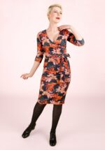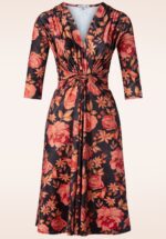 “I see it, i like it, i want it!“ Diese ach so komfortable Luna wurde aus einem angenehmen und dehnbaren, leicht glänzenden Slinky Stoff in Schwarz gefertigt, versehen mit einem Blumenmuster in unterschiedlichen Orangetönen. * Semi Swing Modell * 3/4 Ärmel * V-Ausschnitt * Geknotetes Detail unter der Brust * Plissierter Taillenbund * Kein Reißverschluss oder Knopf; anziehen & ‚ready to go‘! * Fällt bei einer Größe von 1,70 m etwas über das Knie * Exklusiv bei Topvintage erhältlich