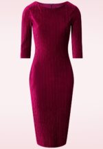 “Va-Va-Va-Voom, uhm…. velvet!“ Die kurvenliebende Laura wurde aus einem dickeren, aber angenehmen und dehnbaren, plissierten Stoff in Weinrot gefertigt, der die luxuriöse Optik und Haptik von Samt zeigt. * Etuikleid * Hohe, runde Halslinie * 3/4 Ärmel * Verdeckter Reißverschluss hinten * Fällt bei einer Größe von 1,70 m weit über das Knie * Exklusiv bei Topvintage erhältlich * Bitte beachte: Die Farbe der Hose im Video kann von der tatsächlichen Farbe der Hose abweichen