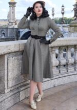 Elegant bis ins Detail: Das Swingkleid Manel Abalone aus der neuen Kollektion von Miss Candyfloss wurde von der herausragenden französischen Modedesignerin Marie-Louise Carven inspiriert, die in den 1940er und 1950er Jahren Pionierarbeit leistete. Das langärmelige Modell mit klassischem Peter-Pan-Kragen und fest vernähtem Krawattendetail versprüht zeitlosen Charme. Der taillierte Schnitt zaubert eine wunderschöne feminine Silhouette, während der geschmeidige Stoff einen eleganten Vintage-Look erzeugt. Das Kleid wird mit einem Reißverschluss am Rücken und Knöpfen vorne geschlossen. * Swing-Style * Peter-Pan-Kragen * Fest vernähtes Krawattendetail * Lange Ärmel mit Manschetten * Schmeichelnde Raffungen im Brustbereich * Knopfleiste vorne * Verdeckter Reißverschluss hinten * Abnehmbarer Gürtel für eine besonders betonte Taille * Mit Taschen! * Endet bei einer Körpergröße von 1,70 m unterhalb des Knies