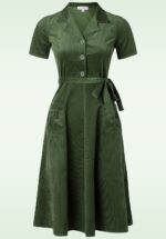 Verleihe deinem Kleiderschrank etwas ‚fourties flair‘ mit diesem Kleid! Es hat einen V-Ausschnitt mit einem verspielten Reverskragen, kurze Puffärmel und eine Knopfreihe. Der Bindegürtel betont deine Taille und sorgt für eine super feminine Silhouette. Hergestellt aus einer festen, aber angenehmen und weichen, vintagegrünen Cord-Baumwolle (stretcht nicht) – trägt sich herrlich. Spielt dein Vintage-Herz auch schon verrückt? 😉 * Semi-Swing Kleid * V-Ausschnitt * Reverskragen * Kurze Puffärmel * Knopfreihe vorne * Abnehmbarer Bindegürtel * Taschen vorne * Verdeckter Reißverschluss an der Seite * Fällt bei einer Größe von 1,70 m übers Knie