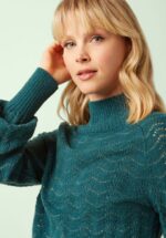 70er-Jahre-Feeling mit goldenem Glanz! Dieses fein gestrickte Oberteil versprüht Retro-Charme mit einer modernen Note. Das Modell hat einen eleganten Stehkragen und lange Bischofsärmel, die eine feminine Silhouette zaubern. Das grafische Lochmuster in warmen Seventies-Farben wird durch eingewebte dezente Glitzerfäden aufgewertet, die für funkelnde Akzente sorgen. Gefertigt aus einem weichen Mischgewebe aus Bio-Baumwolle, das herrlich bequem, atmungsaktiv und absolut stylisch ist. * Hoher Kragen * Lochmuster * Bischofsärmel * Ideale Länge auch in Kombination mit Low-Waist-Hosen