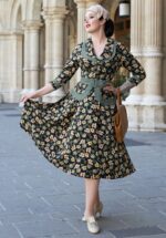 “Look your best in Ashira Lou!“ Ein Prachtexemplar der neuen Kollektion von Miss Candyfloss: “Vintage Glam Icons‘, erinnert an einen zweiteiligen Anzug. Die Kollektion hat sich von den ersten glamourösen Supermodels inspireren lassen! Gefertigt aus einem angenehmen und dehnbaren, schwarzen Viskosemix, der mit wunderschönen Blumen gemustert wurde. * Swing Kleid * Doppelter Kragen * 3/4 Ärmel mit fest umgeschlagenen Saum * Reiß- und Knopfverschluss vorne * Peplum Detail * Abnehmbarer Gürtel für eine besonders tolle Taille * Mit Taschen! * Fällt bei einer Größe von 1,70 m über das Knie