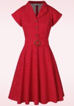 Das ein rotes Kleid nicht langweilig ist, beweist dieses klassische Polka Dot Dance Kleid in Rot! Der feine V-Ausschnitt mit Kragen, die kurzen Ärmel mit Umschlagsaum, die Knopfreihe am Oberteil und der feste Taillengürtel… dieses Kleid strahlt Weiblichkeit aus! Ab der Taille entfaltet es sich in einen fließenden Semi-Swing Rock MIT praktischen Seitentaschen, der sich elegant mitbewegt. Hergestellt aus einem festen, aber luftigen, lippenstiftroten Baumwollmix, der kaum stretcht und mit weißen Pünktchen verziert wurde – trägt sich herrlich. „Life is too short for boring clothes!“   * Semi-Swing Kleid * V-Ausschnitt * Knopfreihe * Kurze Ärmel mit festen Umschlägen * Fester Taillengürtel * Seitentaschen * Verdeckter Reißverschluss hinten * Fällt über das Knie bei einer Größe von 1,70 m