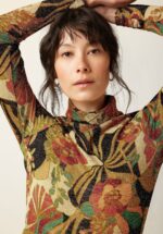 “For those who dare to bloom and sparkle!” Dieser Hingucker zeigt nicht nur ein retro-inspiriertes Blumenmuster, es wurde aus einem leicht transparenten Stoff mit einem eingearbeiteten Glitzerfaden in Gold gefertigt… we love it! * Kleiner Rollkragen * Leicht transparenter Stoff * Lange Ärmel * Lang genug, um mit einer normalen Hose getragen zu werden * Bitte beachte: Die Farbe der Hose im Video kann von der tatsächlichen Farbe der Hose abweichen.