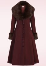 Winterliche Eleganz! Dieser elegante Mantel ist nicht nur wunderschön anzusehen, sondern hält dich auch kuschelig warm! Aus einem luxuriösen, etwas dickeren, weichen bordeauxroten Stoff (ohne Stretch), der für zusätzlichen Tragekomfort vollständig gefüttert ist. * Semi-Swing-Modell * Knopfleiste * Vollständig gefüttert * Abnehmbarer Kragen aus schokoladenbraunem Kunstpelz * Lange Ärmel * Abnehmbare schokoladenbraune Kunstfellmanschetten * Seitliche Eingrifftaschen * Knopfdetails auf der Rückseite * Endet bei einer Körpergröße von 1,70 m unterhalb des Knies