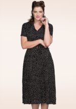 Fühle dich wie in den 40er Jahren, denn dieses Kleid hat die typische Ausstrahlung der 40er Jahre. Es hat einen V-Ausschnitt, einen Reverskragen, kurze Ärmel, eine Knopfreihe und einen langen fließenden Rock. Gefertigt aus einer luftigen und angenehm fallenden, nicht dehnbaren Viskose in Schwarz wurde es mit weißen Polka Dots übersät und trägt sich herrlich. & was sehe ich da? Liegt diese Polkadot Beauty schon in deinem Warenkorb?! ;- * Semi-Swing Modell * V-Ausschnitt * Reverskragen * Kurze Ärmel * Knopfreihe * Abnehmbarer Gürtel für eine besonders tollt Taille * Seitentaschen * Reißverschluss hinten * Fällt bei einer Größe von 1,70 m weit über das Kie