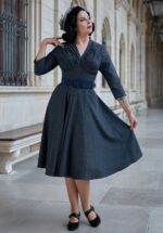 “The beauty in blue has arrived!“ Dieses feminine Swing Kleid der neuen Kollektion der Marke Miss Candyfloss ‚Vintage Glam Icons‘ hat sich von den glamourösen ersten Supermodels inspirieren lassen! Gefertigt aus einem festen, kaum dehnbaren, aber angenehm fallenden Strukturstoff in Marineblau. * Swing Modell * 3/4 Ärmel * Schmeichelhaft plissierter Brustbereich * Abnehmbarer Gürtel für eine besonders schöne Taille * Mit Taschen! * Verdeckter Reißverschluss hinten * Fällt bei einer Größe von 1,70 m über das Knie