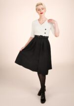 “’Let the outfit do the talking!“ Dieses kontrastierende Swing Schätzchen mit 1/2 Ärmeln und einem eleganten Wickeltop zeigt große Knöpfe und wurde aus einem etwas dickeren, aber angenehmen, leicht dehnbaren Stoff in Schwarz und Off White gefertigt, der sich herrlich trägt. * Swing Kleid * V-Ausschnitt mit Wickeloptik und verborgenem Druckknopf * 1/2 Ärmel mit fest umgeschlagenen Saum * Knopfreihe vorne * Abnehmbarer Gürtel für eine besonders tolle Taille * Mit Taschen! * Fällt bei einer Größe von 1,70 m über das Knie