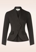 Mit dem raffiniert geschnittenen Blazer Coline Sadie verleihst du jedem Outfit eine besondere Note. Dieses tolle Modell in einem warmen Dunkelbraun wurde von der Schneiderkunst der 1940er Jahre inspiriert. Der im Nacken hochgezogene Stehkragen, die außergewöhnliche Knopfleiste und praktische Pattentaschen zaubern einen eleganten Look. Der körperbetonte Schnitt betont deine Figur auf dezente Weise und sorgt für einen stylischen, femininen Auftritt. * Figurbetonter Schnitt * Elastisch * Nähte im hinteren Schulterbereich * Lange Ärmel * Knopfleiste * Mit Pattentaschen! * Ideal dazu: der passende Trompetenrock Enora Sadie für einen stylischen Look von Kopf bis Fuß