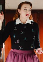 Dieses 50s Sophia Evening Jersey Top in Black hat das Zeug um dein neues Lieblingstop zu werden! Dieses schöne Top hat eine hohe Halslinie mit einem schmalen Stehkragen, ein elegantes Wickel-Detail und ¾ Ärmel. Hergestellt aus geschmeidiger, schwarzer Baumwolle die herrlich dehnbar ist und eine schöne Passform ergibt. Pfiffig oder doch lieber klassisch? Die schöne Sophia macht alles mit! 😉    * Hohe Halslinie mit schmaler Stehkragen  * ¾ Ärmel * Schlüsselloch-Detail mit Knopfverschluss auf der Rückseite  * Ausreichend lang, du kannst es zu einer Hüfthose tragen