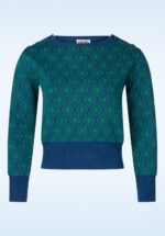 Retro Vibes – Dieser tolle Pulli sieht nicht nur wunderschön aus, er hält dich an kälteren Tagen auch herrlich warm! Gefertigt aus einer feingestrickten, angenehmen und dehnbaren Bio-Baumwolle mit einem Retromuster in Marineblau und Grün. * Funktionale Knöpfe an der Schulter * Stretchy Rippbündchen * Lang genug, um mit einer normalen Hose kombiniert zu werden