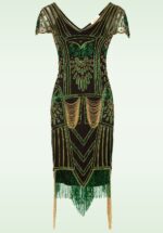Das Flair der wilden 20er Jahre mit modernem Glanz: Dieses von Hand bestickte partytaugliche Kleid ist eine Neuauflage der eleganten Flapper-Kleider aus den 1920er Jahren! Das Modell aus schwarzem, halbtransparentem Stoff mit leichtem Stretchanteil ist mit glänzenden Perlen und Fransen in Grün und Gold versehen. Mach dich bereit für Glanz und Glitzer! * Figurbetonter Schnitt * Von Hand bestickt * Glattes Unterkleid * V-Ausschnitt vorne und hinten * Gewellte Kappenärmel * Fransen * Kein Reißverschluss, keine Knöpfe: einfach reinschlüpfen und los geht’s! * Endet bei einer Körpergröße von 1,70 m unterhalb des Knies