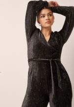 Chic, sleek & a little mystique. This stylish jumpsuit exudes pure seventies glamour. She is styled with long, slightly puffed sleeves and elegant wide legs, creating a graceful silhouette. The subtle gold-yellow print comes to life beautifully on the velvety black fabric blend, which feels soft and stretches slightly for a comfy fit.    * Jumpsuit * V-neckline with a fixed wrap over * Long puff sleeves  * Fixed tie straps for a ’snatched‘ waist * No zipper or buttons: just slip it on and you’re ready to go! * It has pockets!  * Long wide legs