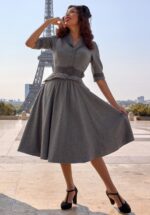 Eine Hommage an zeitlose Weiblichkeit: bei diesem Modell trifft ein softer Schnitt auf die Romantik des Pariser Winters. Das Swingkleid Lylou aus der neuen Kollektion von Miss Candyfloss wurde von der herausragenden französischen Modedesignerin Marie-Louise Carven inspiriert, die in den 1940er und 1950er Jahren Pionierarbeit leistete und die Modegeschichte nachhaltig prägte. Gefertigt ist es aus einem festen, aber dennoch weichen grauen Stoff (kaum dehnbar) mit schwarzem Schottenkaro. Einfach traumhaft angenehm zu tragen! * Swing-Style * Kragen * ¾-Puffärmel mit Manschetten * Schmeichelnde Raffungen im Brustbereich * Knopfreihe mit verstecktem Druckknopf * Abnehmbarer Gürtel für eine besonders betonte Taille * Mit Taschen! * Endet bei einer Körpergröße von 1,70 m unterhalb des Knies