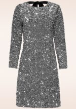 Ab mit dir ins Rampenlicht! Dieses partytaugliche A-Linien-Kleid ist aus einem samtigen, leicht dehnbaren grauen Stoff gefertigt, der mit silbernen Pailletten besetzt ist. Auf der Rückseite ist das Modell mit einer schwarzen Schleife versehen. * Ausgestellter Schnitt * Hoher Rundhalsausschnitt * Schwarze Schleife auf der Rückseite * Kein Reißverschluss, keine Knöpfe: einfach reinschlüpfen und los geht’s! * Vollständig gefüttert * Endet bei einer Körpergröße von 1,70 m knapp über dem Knie