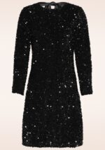 Ab mit dir ins Rampenlicht! Dieses partytaugliche A-Linien-Kleid ist aus einem samtigen, leicht dehnbaren schwarzen Stoff gefertigt, der mit Pailletten besetzt ist. Auf der Rückseite ist das Modell mit einer schwarzen Schleife versehen. * Ausgestellter Schnitt * Hoher Rundhalsausschnitt * Schwarze Schleife auf der Rückseite * Kein Reißverschluss, keine Knöpfe: einfach reinschlüpfen und los geht’s! * Vollständig gefüttert * Endet bei einer Körpergröße von 1,70 m knapp über dem Knie