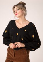“We LOVE sweater season!“ Dieser Pulli wurde aus einem weichen, warmen, feingestrickten Viskosemix in Schwarz gefertigt und allover mit gestickten, gold(ig)farbenen Herzchen gemustert. – Wahre Liebe! * Oversized * V-Ausschnitt * Lange Ballonärmel * Stretchy Rippbündchen * Lang genug, um mit einer normalen Hose kombiniert zu werden * Bitte beachte: Die Farbe der Hose im Video kann von der tatsächlichen Farbe der Hose abweichen