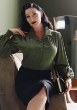 “The secret of great style is to feel good in what you wear!“ Diese wundervolle Bluse wurde aus einem festen, nicht dehnbaren, aber angenehmen, olivgrünen Crincle Stoff gefertigt, versehen mit einem Hauch Bambus – trägt sich herrlich. * Reverskragen * Lange Puffärmel mit elastischem Smok * Knopfreihe * Lang genug, um mit einer normalen Hose kombiniert zu werden
