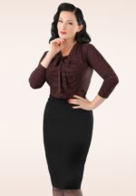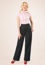 Dieses elegante Modell wurde von den Stoffhosen inspiriert, die die moderne Frau der 1940er und 1950er Jahre trug! Die feminine, hohe Taille bildet einen tollen Kontrast zum weiten Bein und schmeichelt vor allem Frauen mit etwas fülligeren Hüften und Gesäß. Die seitlichen Knöpfe setzen einen besonderen Akzent. Das Modell ist aus einem geschmeidigen schwarzen Stoff mit leichtem Stretchanteil gefertigt und an den Beinen mit klassischen Umschlägen versehen. In Kombination mit einer weißen Bluse und Pumps ergibt sich ein perfekter Business-Look im Retro-Stil! * Weite Hosenbeine * Verdeckter Reißverschluss mit Haken an der Seite * Die Hosenbeine lassen sich problemlos kürzen * Die abgebildete Bluse ist leider nicht mehr in unserem Shop erhältlich.
