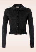 Dieser niedliche 40s April Bow Cardigan in Black hat unser Herz gestohlen! Klassisch und verspielt, mit eleganten 1/2 Ärmeln, einem süßen Bubikragen und hübschen, kleinen Schleifen. Hergestellt aus einem weichen, dehnbaren, schwarzen Viskose-Mix in Feinstrick. Unendlich verwandlungsfähig! * Kurzes Modell * Mit verdeckten Druck-Knöpfchen * Elastischen Rippborten an den Ärmeln und am Saum