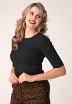 Schlicht und gleichzeitig elegant dank bezaubernder Details: Dieses entzückende Oberteil mit U-Boot-Ausschnitt hat schmeichelhafte ¾-Ärmel, die mit Schlitzen und kleinen Schleifen versehen sind. Das Modell in Schwarz ist aus einem herrlich geschmeidigen und dehnbaren Viskosegemisch gefertigt, das auch nach vielen Wäschen seine Form behält. Ein vielseitiges, klassisches Oberteil, das jede Vintage-Lady in ihrem Kleiderschrank haben sollte! * U-Boot-Ausschnitt * ¾-Ärmel mit kleinen Schleifen * Passend für Hosen mit normaler Leibhöhe