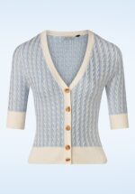 Diese 60er Regatta Race Stripe Knit Strickjacke in Blau muß du einfach haben! 😉 Dieser Cardigan hat eine V-Halslinie, 3/4 Ärmel und eine Knopfleiste mit Holzknöpfen. Hergestellt aus einer weichen und herrlich dehnbaren, hellblauen Viskosemischung in ein schönes Zopfmuster mit elfenbeinfarbenen Details. Dieses Schätzchen wird dein sixties Outfit perfekt ergänzen!   * V-Halslinie * 3/4 Ärmel * Knopfleiste * Elastische Rippborten