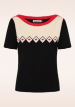 Hallo Herzchen! – Dieser bequeme Strickpullover hat eine hohe, rote Halslinie, kurze Puffärmel und wurde vorne mit einem Herz- Karomuster vollendet. Gefertigt aus einem herrlich angenehmen, feingestrickten und dehnbaren Viskosemix in Schwarz und Creme, der sich herrlich trägt.  * Hohe Halslinie * Kurze Puffärmel * Stretchy Rippbündchen * Lang genug, um mit einer normalen Hose kombiniert zu werden
