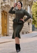 “This stunning piece is designed to make a statement!“ Stammend aus der neuen Kollektion der Marke Miss Candyfloss: “Vintage Glam Icons“ erinnert es an die glamourösen ersten Supermodels! Dieses figurumspielende Schätzchen wurde aus einem festen, aber angenehmen, grauen Stoffmix gefertigt und zeigt Details in Terracotta. * Pencil Modell * Spitzer Kragen * Lange Ärmel mit Manschetten * Knopfreihe vorne * Mit Taschen! * Abnehmbarer Gürtel, für eine besonders tolle Taille * Verdeckter Reißverschluss hinten * Peplum Detail * Gehschlitz hinten * Fällt bei einer Größe von 1,70 m über das Knie