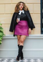 Ein A-Linien Rock sorgt für Style! – Jessy wird hochtailliert getragen und entfaltet sich ab da in eine spielerische A-Linie. Gefertigt aus einem festen, aber dehnbaren, scuba-artigen schwarzen Stoff. * A-Linie * Abnehmbarer Bindegürtel an der Taille * Kein Reißverschluss oder Knopf; anziehen & ‚ready to go‘! * Mit Taschen! * Endet bei einer Größe von 1,70 m oberhalb des Knies * Bitte beachte: Die Farbe der Hose im Video kann von der tatsächlichen Farbe der Hose abweichen.
