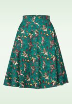 Schnapp dir diese wunderbare Kombination aus Wildem Westen und Rockabilly! Dieser dunkelgrüne Swingrock hat alles, was du dir wünschst: Er ist feminin, verspielt und auffällig. Das Modell mit einer schmeichelhaften hohen Taille und praktischen Taschen schwingt bei jedem Schritt wunderschön mit. Das attraktive Cowgirl-Muster verleiht ihm einen einzigartigen Retro-Look, der perfekt zu Rockabilly-Outfits passt. Der Rock ist aus einem festen, aber dennoch geschmeidigen Baumwollmischgewebe gefertigt, das dank eines geringen Stretchanteils besonders bequem sitzt. * Swing-Modell * Mit Taschen! * Endet bei einer Körpergröße von 1,70 m knapp auf Kniehöhe
