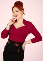 Dieses 50s Sophia Evening Jersey Top in Black hat das Zeug um dein neues Lieblingstop zu werden! Dieses schöne Top hat eine hohe Halslinie mit einem schmalen Stehkragen, ein elegantes Wickel-Detail und ¾ Ärmel. Hergestellt aus geschmeidiger, schwarzer Baumwolle die herrlich dehnbar ist und eine schöne Passform ergibt. Pfiffig oder doch lieber klassisch? Die schöne Sophia macht alles mit! 😉 * Hohe Halslinie mit schmaler Stehkragen * ¾ Ärmel * Schlüsselloch-Detail mit Knopfverschluss auf der Rückseite * Ausreichend lang, du kannst es zu einer Hüfthose tragen