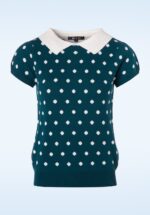 Go retro mit diesem 60s Kristen Polkadot Sweater in Teal and Ivory! Und online exklusiv bei TopVintage erhältlich in Deutschland, Frankreich und der Niederlande! Umwerfend schön und super komfortabel… was wünscht Frau sich noch mehr?! In einem klassischen Schnitt und mit einer runden Halslinie, einem kontrastierenden, runden Kragen und kurzen Puffärmeln. Die elastischen Rippborten sorgen für eine perfekte Passform. Hergestellt aus einem herrlich weichen und dehnbaren Baumwolle-Mix in Feinstrick in der Farbe Petrol. Polkadots on ‚top‘! 😉 * Runde Halslinie * Kontrastierender Kragen * Kurze Ärmel * Elastische Rippborten * Die Länge ist ausreichend um es zu einer Hüfthose tragen zu können
