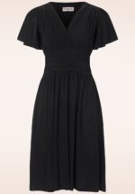 Eine wahre Vintage Beauty eignet sich perfekt für jede Gelegenheit – dieses Kleid wurde aus einem glatten und angenehmen, dehnbaren Slinky Stoff in Schwarz gefertigt, trägt sich herrlich und knittert nicht. Genieße die Komplimente, die du bekommen wirst, wenn du Sadie trägst! * Semi Swing Style * Gefüttertes Top * Feste Wickeloptik * Kurze Schmetterlingsärmel * Plissierter Taillenbund * Kein Reißverschluss oder Knopf; anziehen & ready to go! * Fällt bei einer Größe von 1,70 m über das Knie