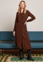 “Time to ‚fall‘ in love‘ mit diesem Kleid! – Dieses durchgeknöpfte Midaxi Kleid ist verspielt, aber auch sehr feminin, denn das Oberteil zeigt einen spitzen Kragen, lange Ärmel mit Manschetten und einen abnehmbaren Bindegürtel an der Taille. Hergestellt aus einem herrlich angenehmen EcoVero Viskosemix (nicht dehnbar) mit einem farbenfrohen Retromuster. Verliebt? * Midaxi Modell * Durchgeknöpftes Kleid * Spitzer Kragen * Lange Ärmel mit Manschetten * Abnehmbarer Bindegürtel für eine besonders tolle Taille * ‚It has pockets!‘ * Kein Reißverschluss * Reicht bei einer Größe von 1,70 m bis über die Wade