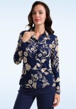 Von der Natur inspirierte Eleganz aus nachhaltiger Herstellung: Diese Bluse besticht durch einen wunderschönen cremefarbenen Print mit Vögeln und Blumen. Sie ist aus einem wunderbar weichen und elastischen EcoVero-Viskosemix in Marineblau gefertigt, der herrlich angenehm zu tragen ist. * V-Ausschnitt * Reverskragen * Lange Ärmel * Knopfleiste * EcoVero * Ideale Länge auch in Kombination mit Low-Waist-Hosen