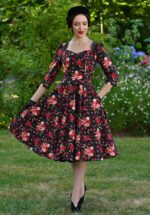 Ein Hauch von Vintage mit zauberhaften Blüten: Dieses Swingkleid versprüht echten Retro-Charme! Das Modell mit schmeichelhaften ¾-Puffärmeln besticht durch einen rechteckigen Ausschnitt mit Zierknöpfen und einen femininen Swingrock, der bei jedem Schritt wunderschön mitschwingt. Der Mohnblumenprint in warmen Rottönen verleiht dem Kleid einen romantischen und gleichzeitig ausdrucksstarken Look. Es ist aus einem festen, aber dennoch geschmeidigen Baumwollmischgewebe in Schwarz gefertigt, das dank eines geringen Stretchanteils für eine perfekte Passform sorgt und herrlich angenehm zu tragen ist. * Swingkleid * Quadratischer Ausschnitt * Zierknöpfe * ¾-Puffärmel * Mit Taschen! * Verdeckter Reißverschluss hinten * Kann für einen besonders festlichen Look mit Petticoat getragen werden * Endet bei einer Körpergröße von 1,70 m unterhalb des Knies